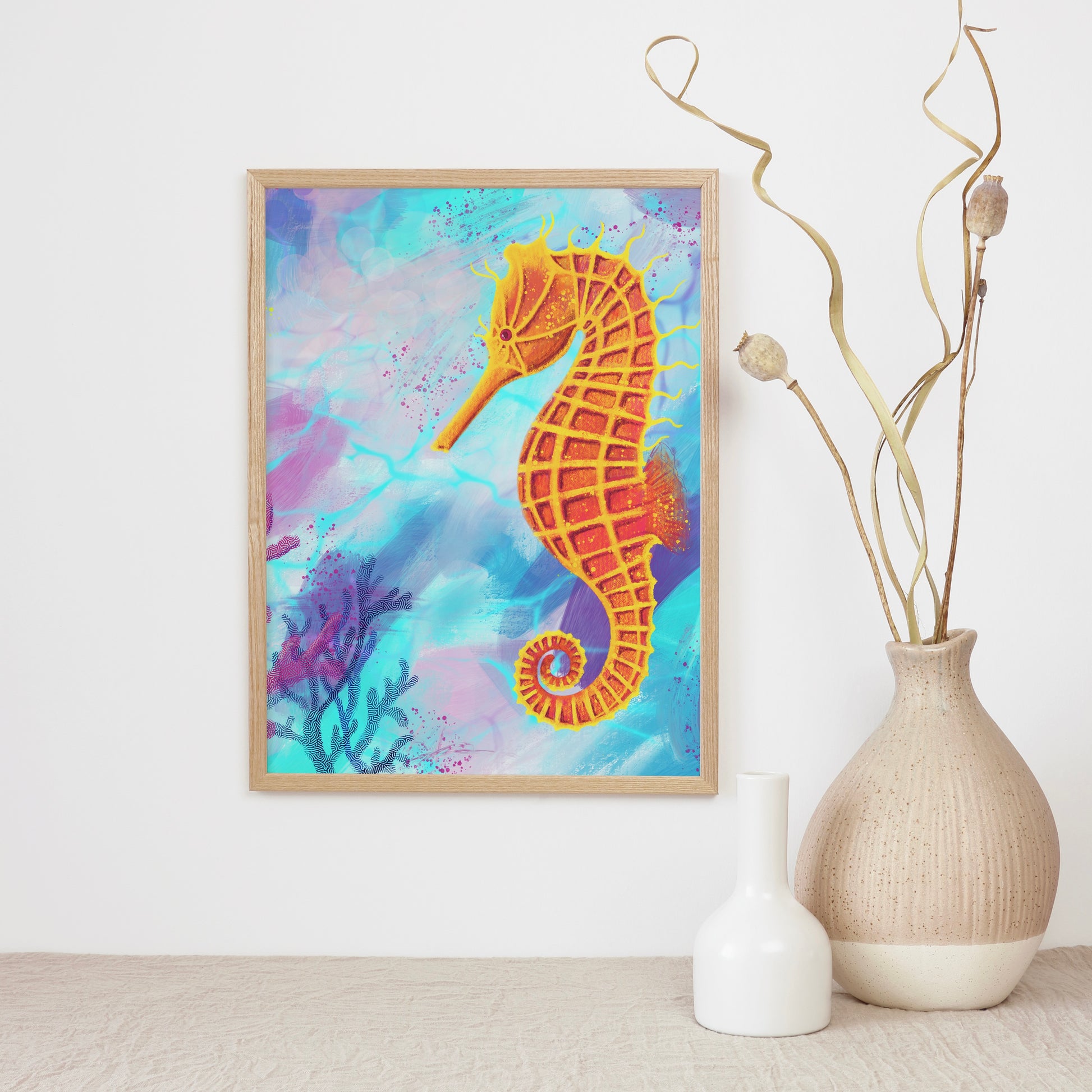 "Callie" Archival Print captures original artwork with vibrant colors on 100% Cotton Fine Art Matte Paper. Enjoy this playful seahorse in a variety of sizes, perfect for framing and displaying in any space.
