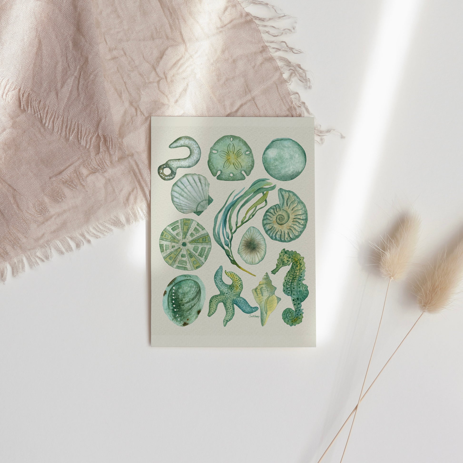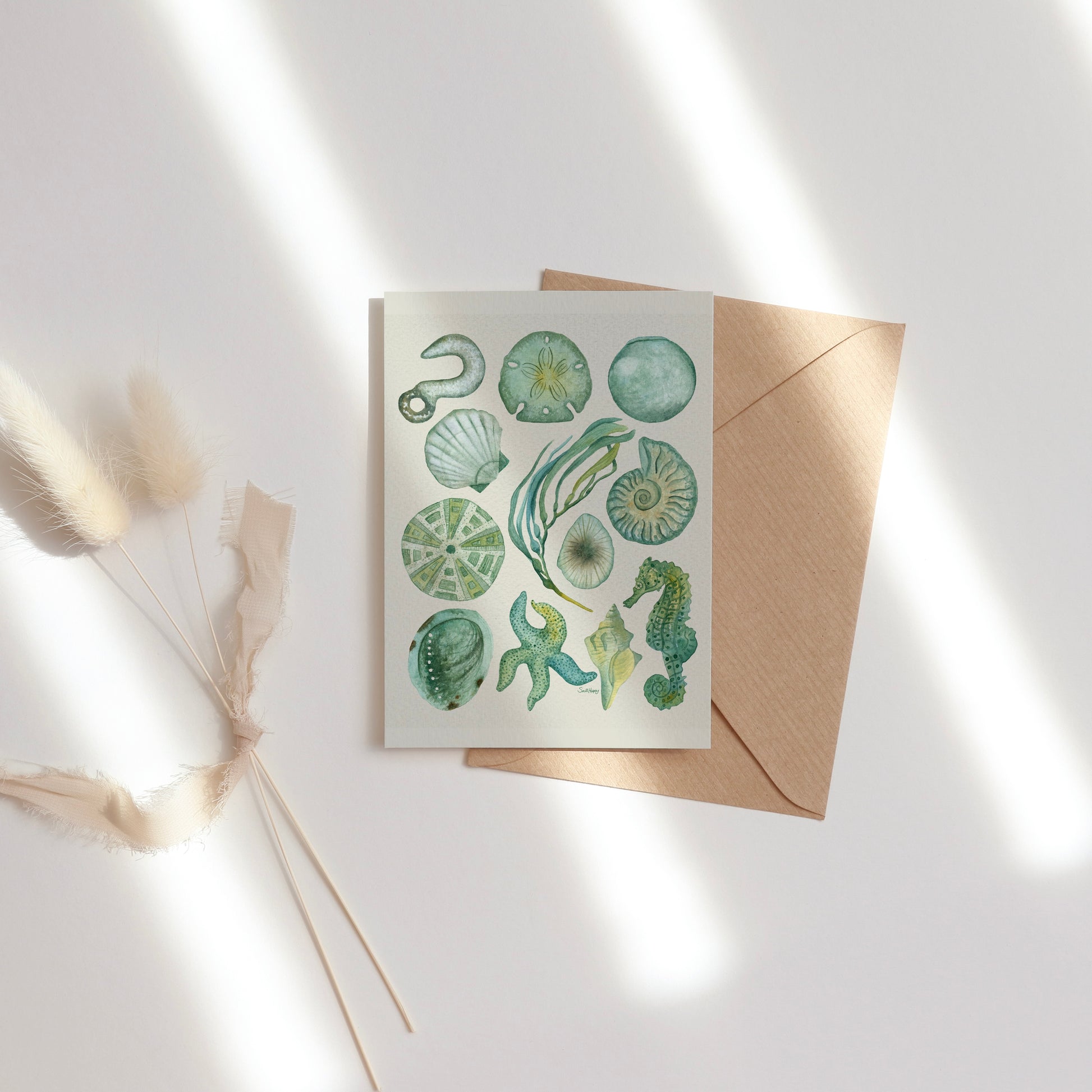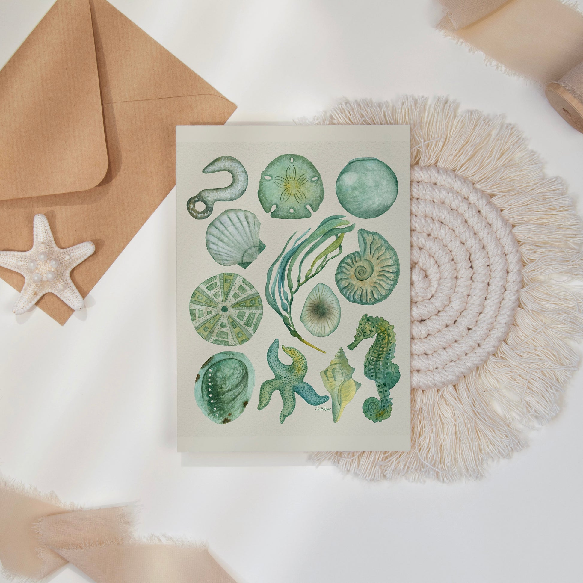 coastal greeting card, seashell art card, ocean theme note card, beach lover stationery, nautical blank card, watercolor seashell card, sea life greeting card, seahorse art card, coastal décor stationery, eco friendly greeting card, ocean inspired card, beach wedding card, sea creature illustration card, handmade greeting card, coastal birthday card