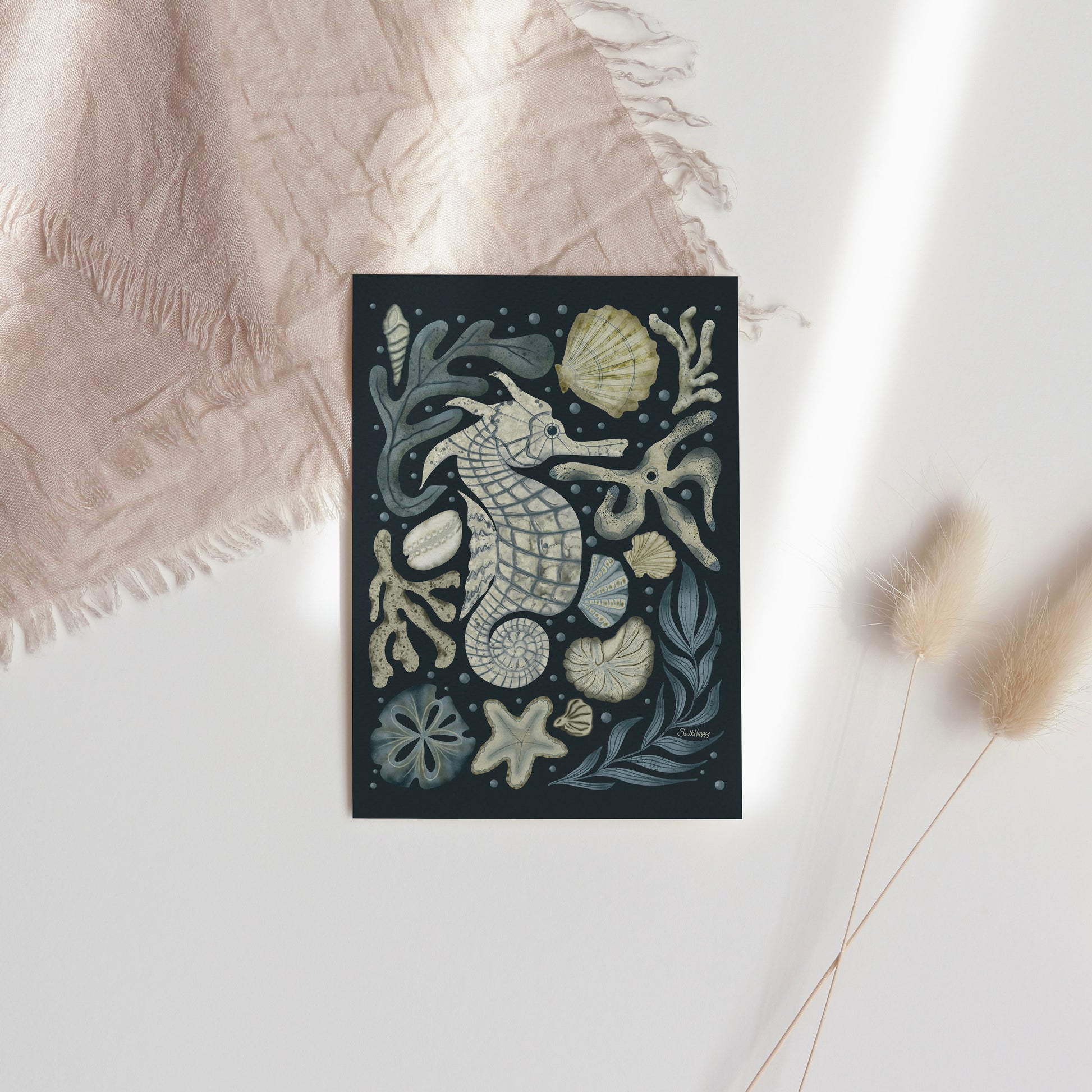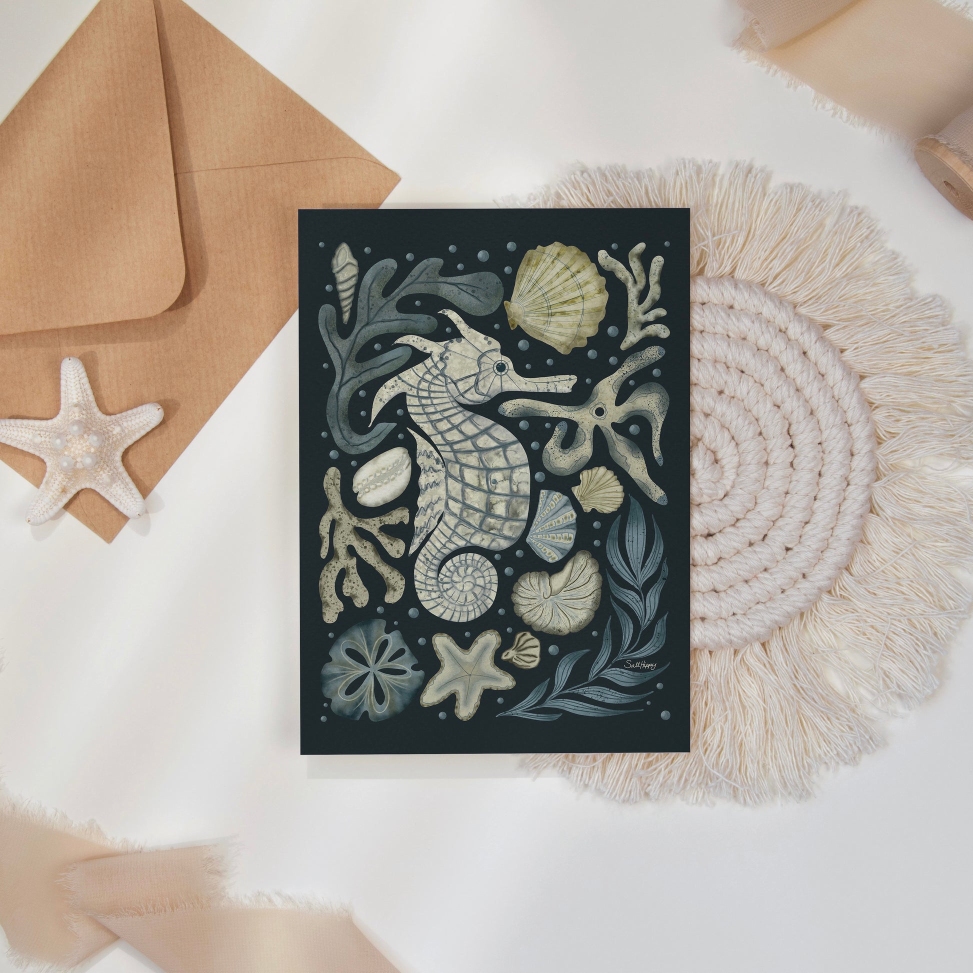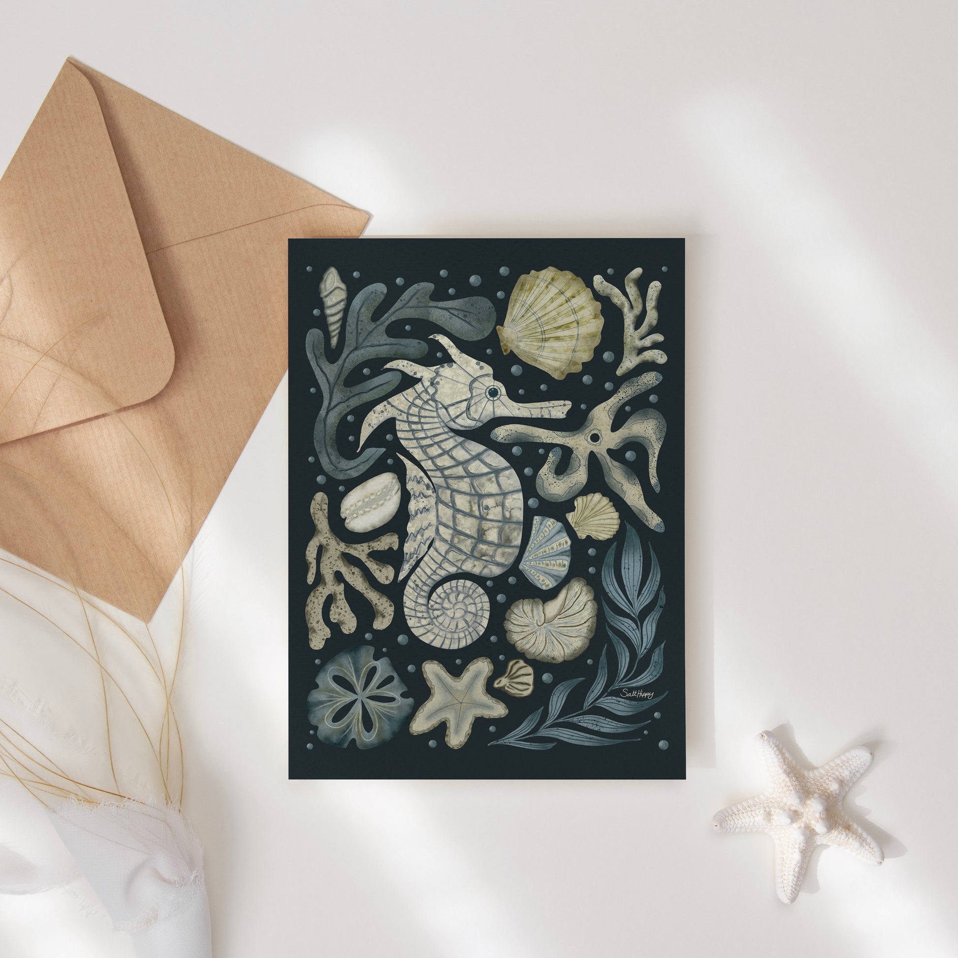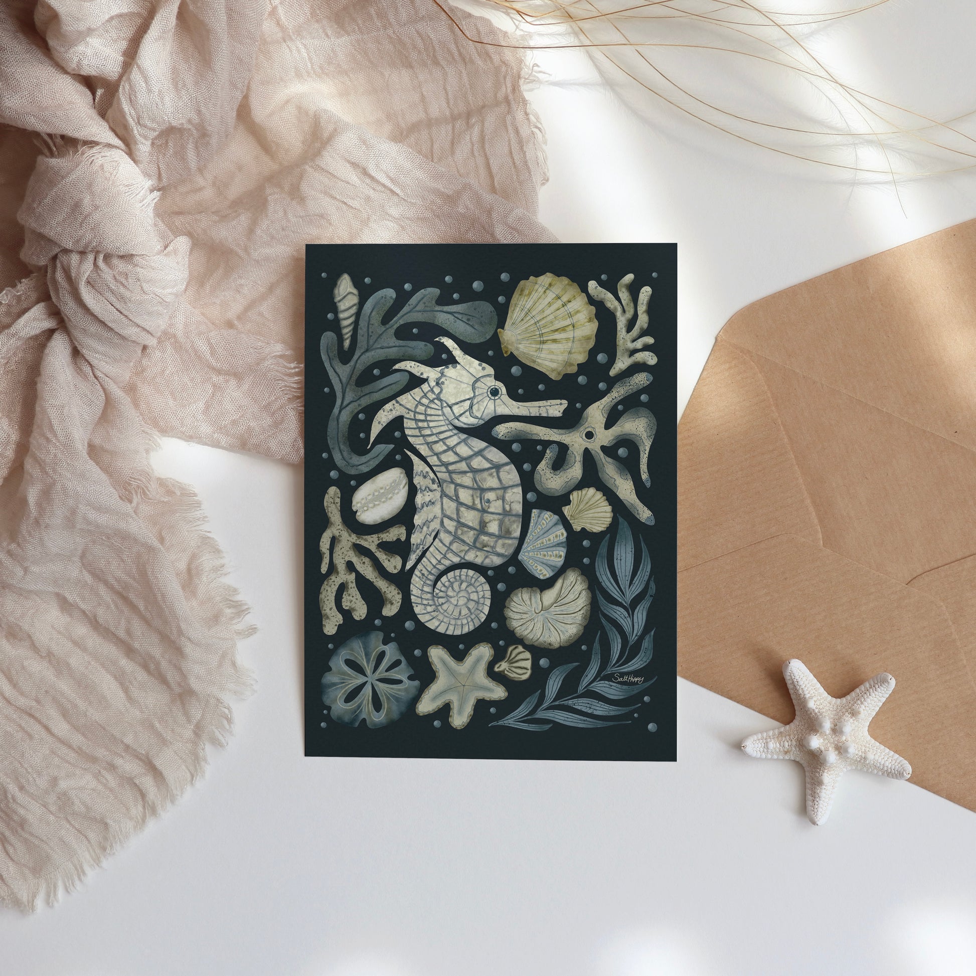Capture the charm of the ocean with this seahorse greeting card, featuring an original artwork of a graceful seahorse surrounded by seashells, coral, and sea-inspired details. This 4x5.5 blank card is perfect for ocean lovers, beach-themed events, or simply sending a thoughtful note..