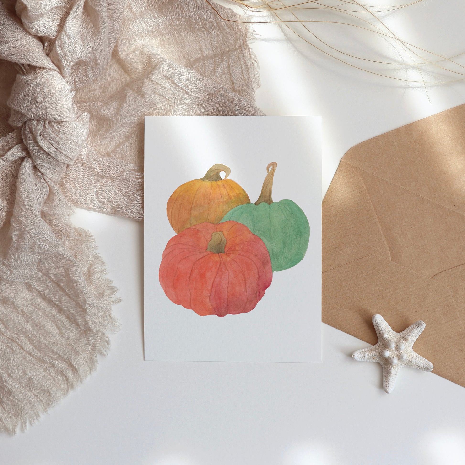 Add a special touch to your correspondences with this set of 5 watercolor note cards this holiday season, featuring original watercolor "Earthy Pumpkins" painted by Chulynda Castellanos. Perfect for sending special notes or as a thoughtful gift.