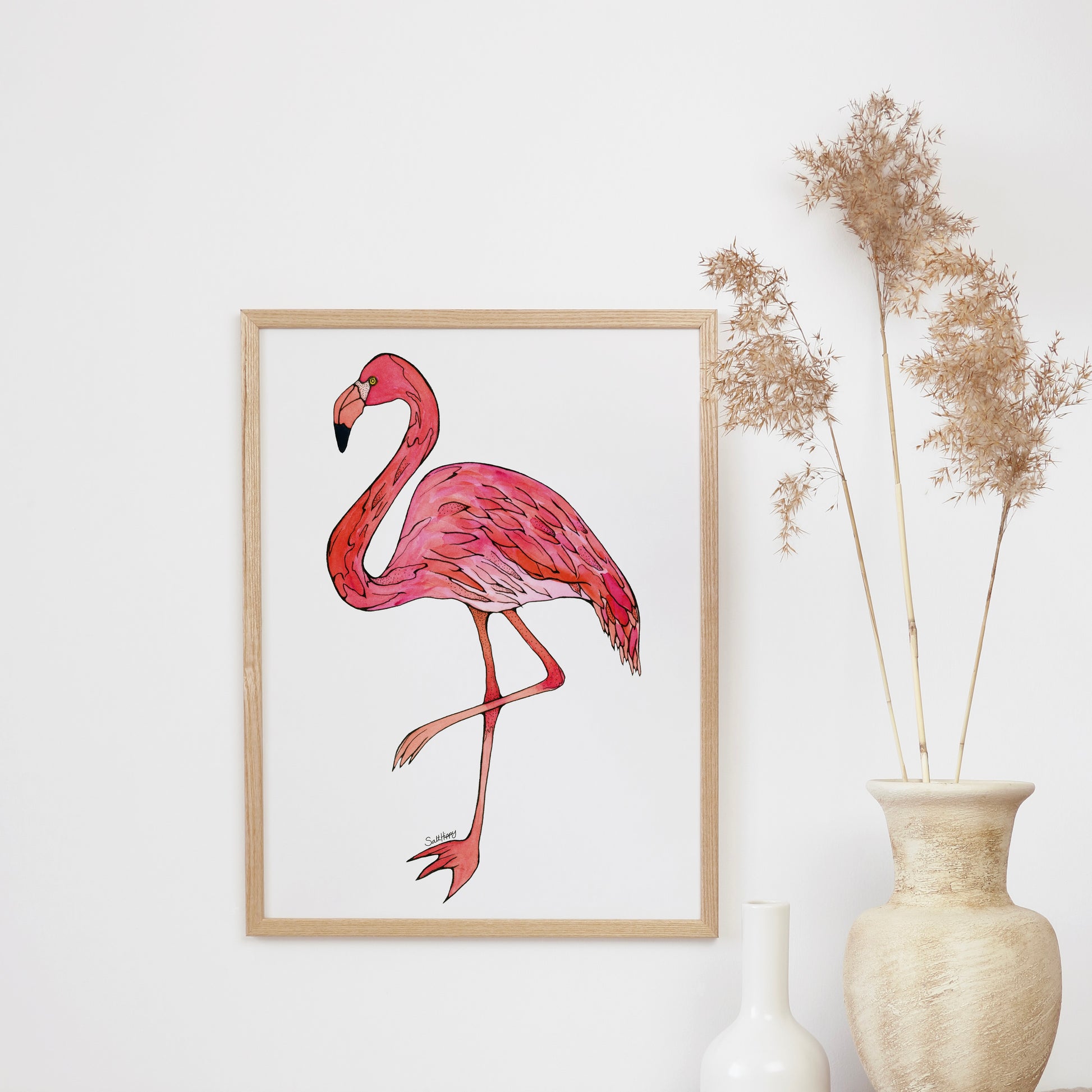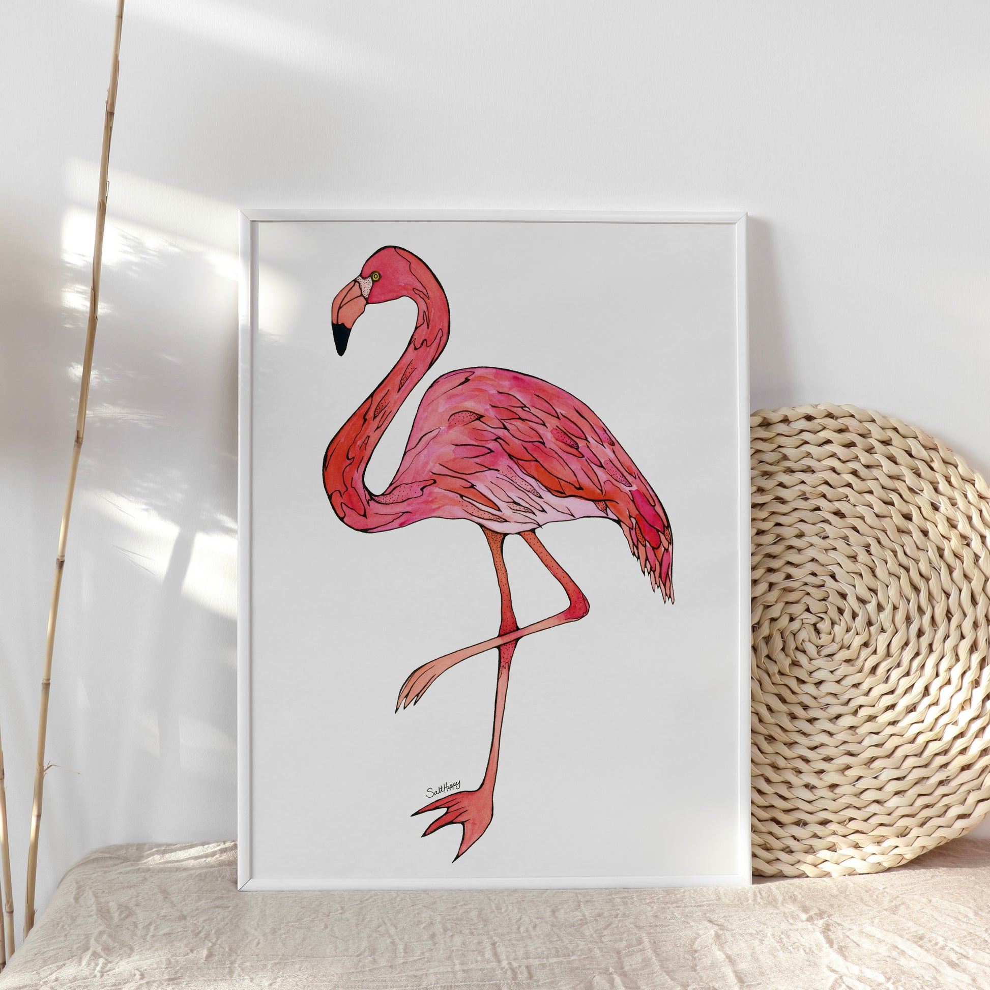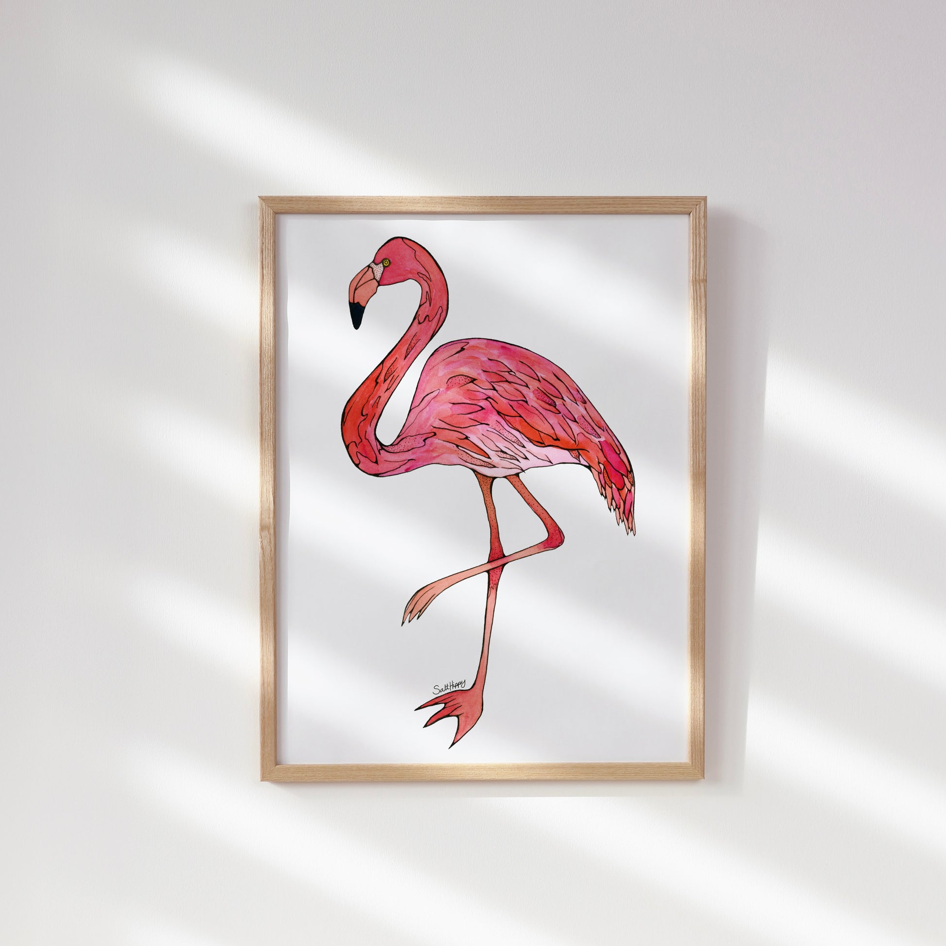 Add a bold pop of color and personality to your space with this hand-painted flamingo, brought to life with vibrant watercolor and expressive ink. This artwork captures the iconic stance and playful charm of the flamingo, with fluid brushstrokes and fine detailing that highlight its natural elegance and flair.