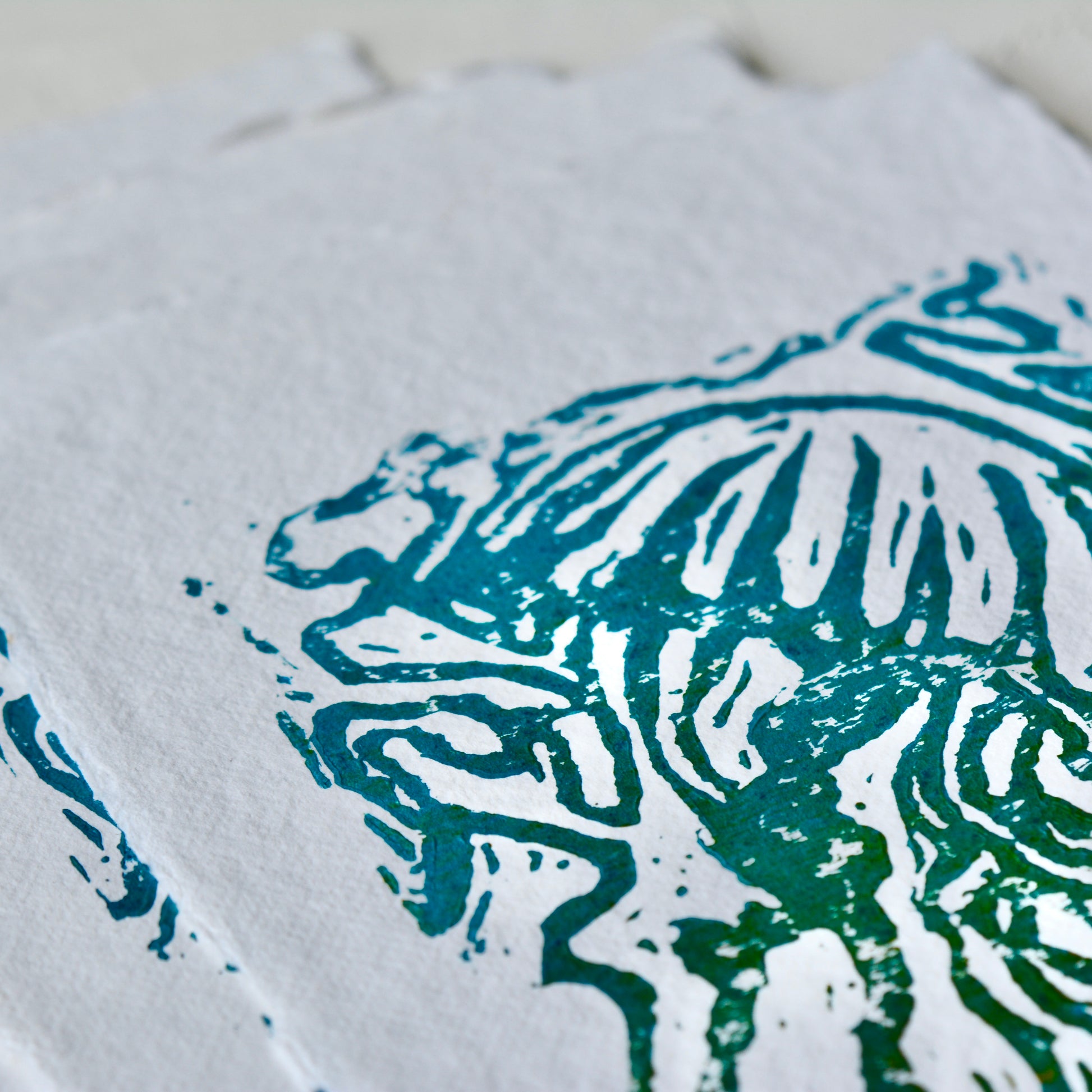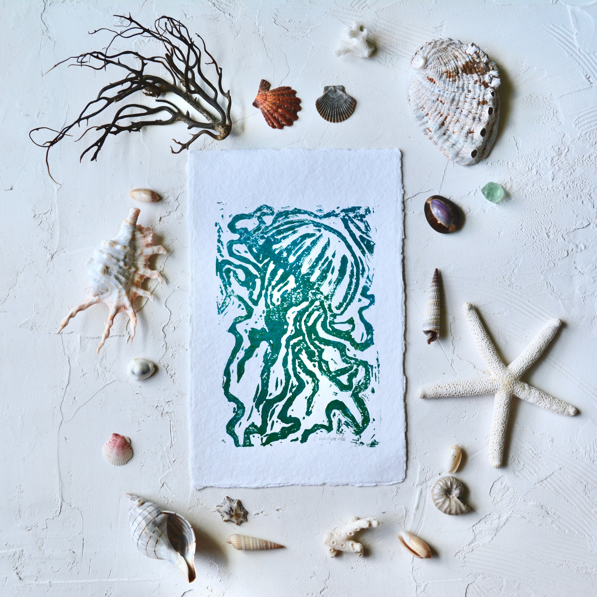 Dive into the whimsical world of our handmade Jellyfish Block Print! Hand-printed on 100% cotton deckled edge paper, this playful print will add a touch of fun to any space.