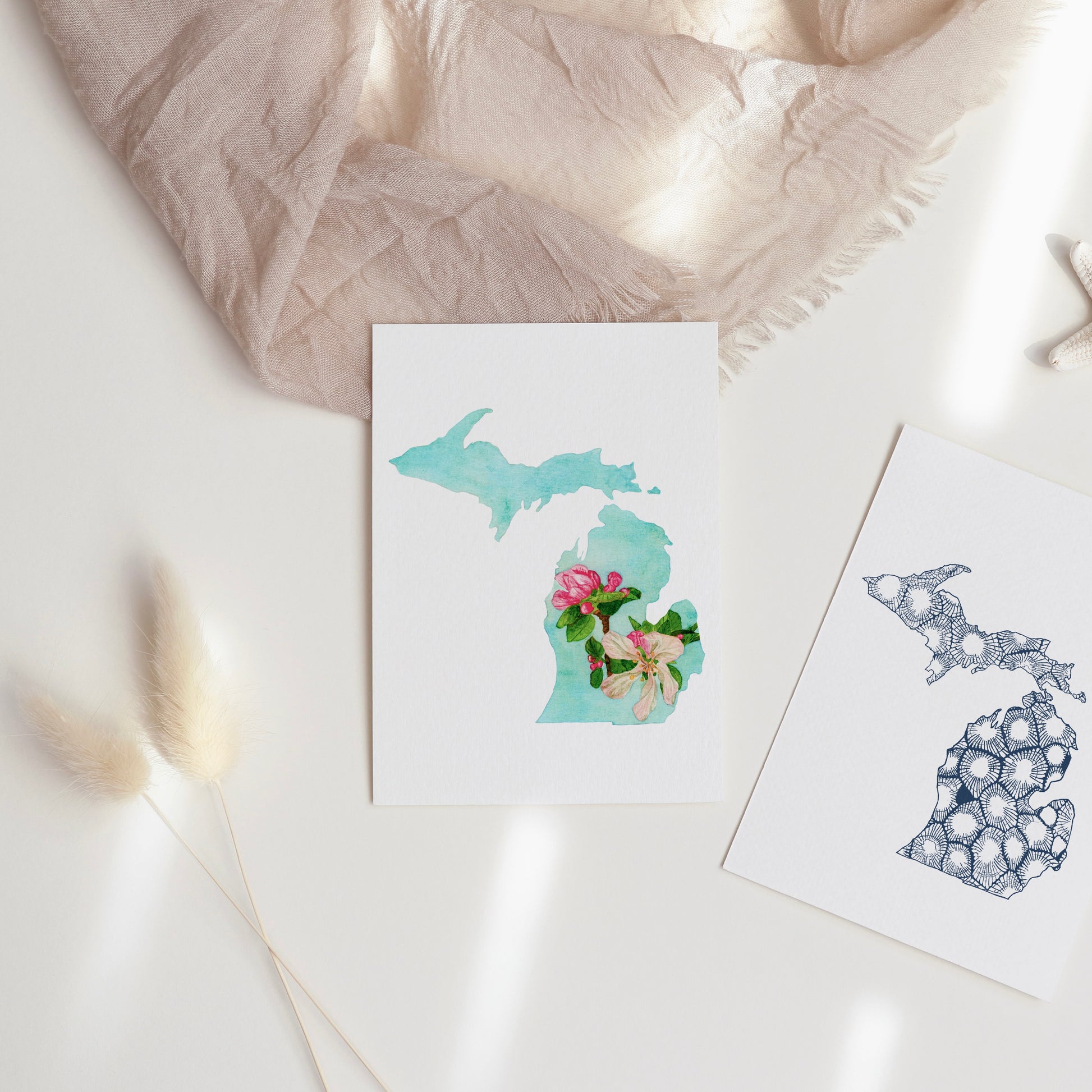 Add a special touch to your correspondences with this set of 5 watercolor note cards, featuring original Michigan Apple Blossom painted by Chulynda Castellanos. Perfect for sending special notes or as a thoughtful gift.