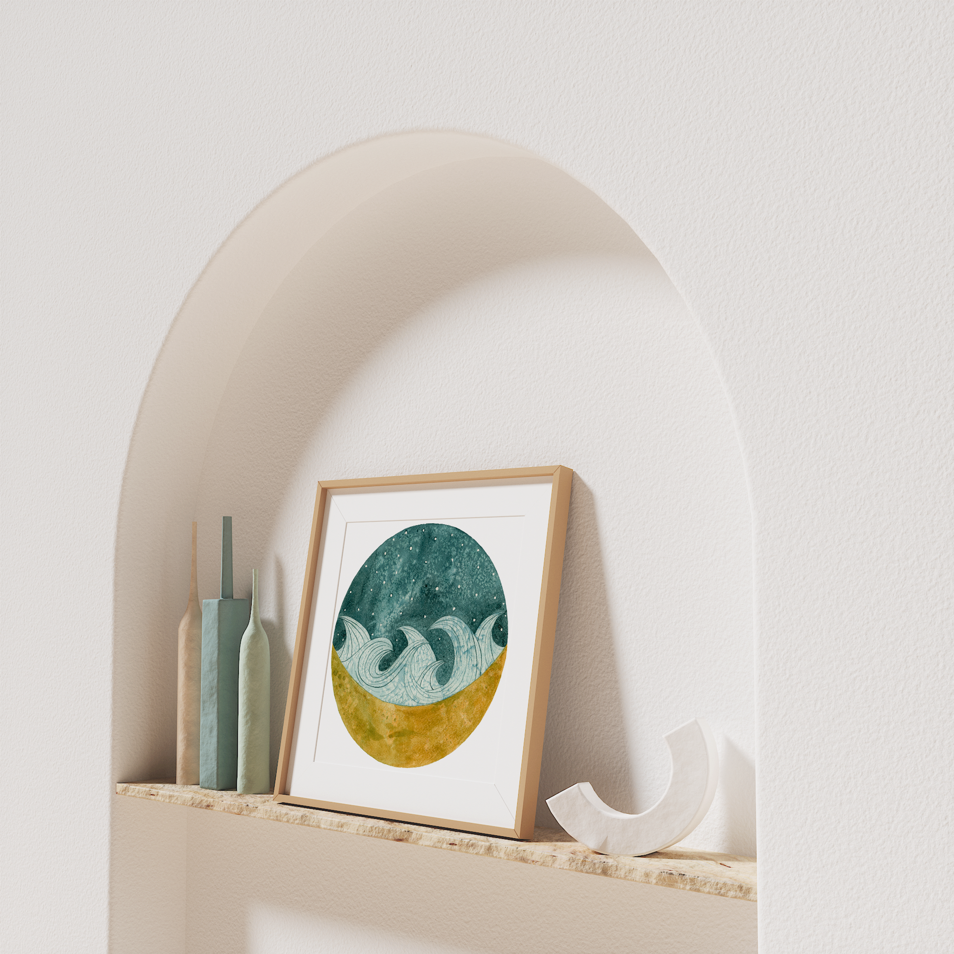 Print of "Moon Wave" original watercolor artwork by Chulynda Castellanos. This print is suitable for framing or an excellent gift for a lover of ocean art.
