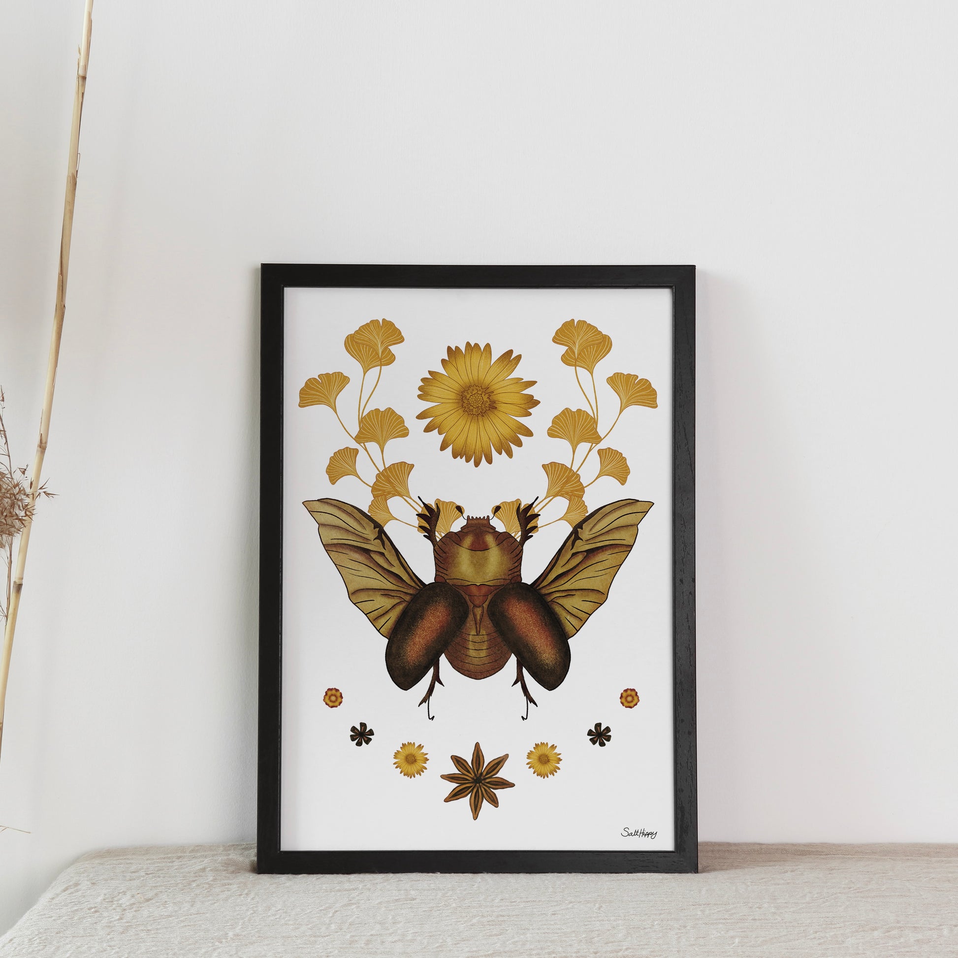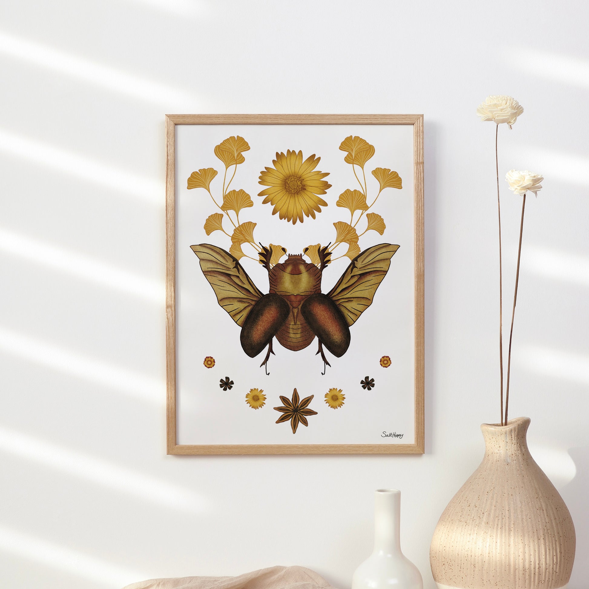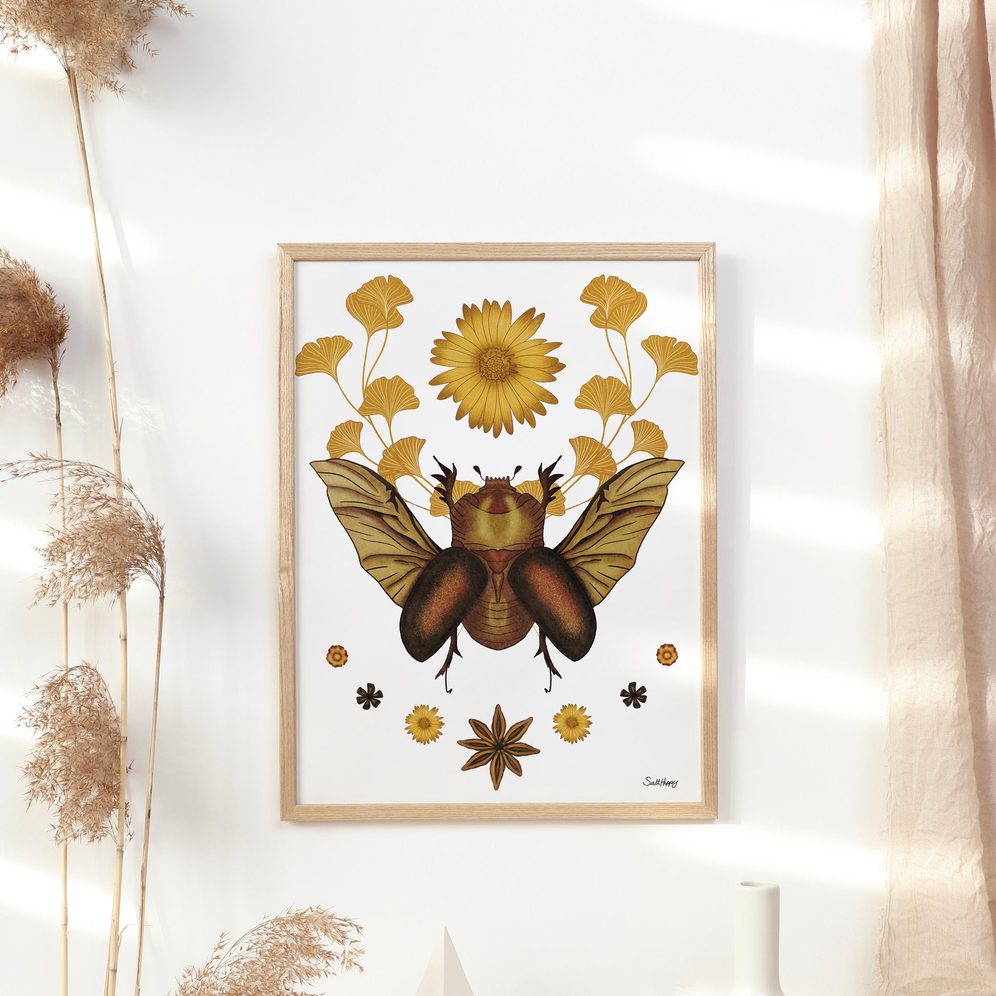 Bring warmth and earthy charm to your space with this Fall Moth Botanical Art Print. Featuring a beautifully detailed rhino beetle surrounded by golden ginkgo leaves and a radiant camphor flower, this artwork blends vintage botanical illustration with a modern boho aesthetic.