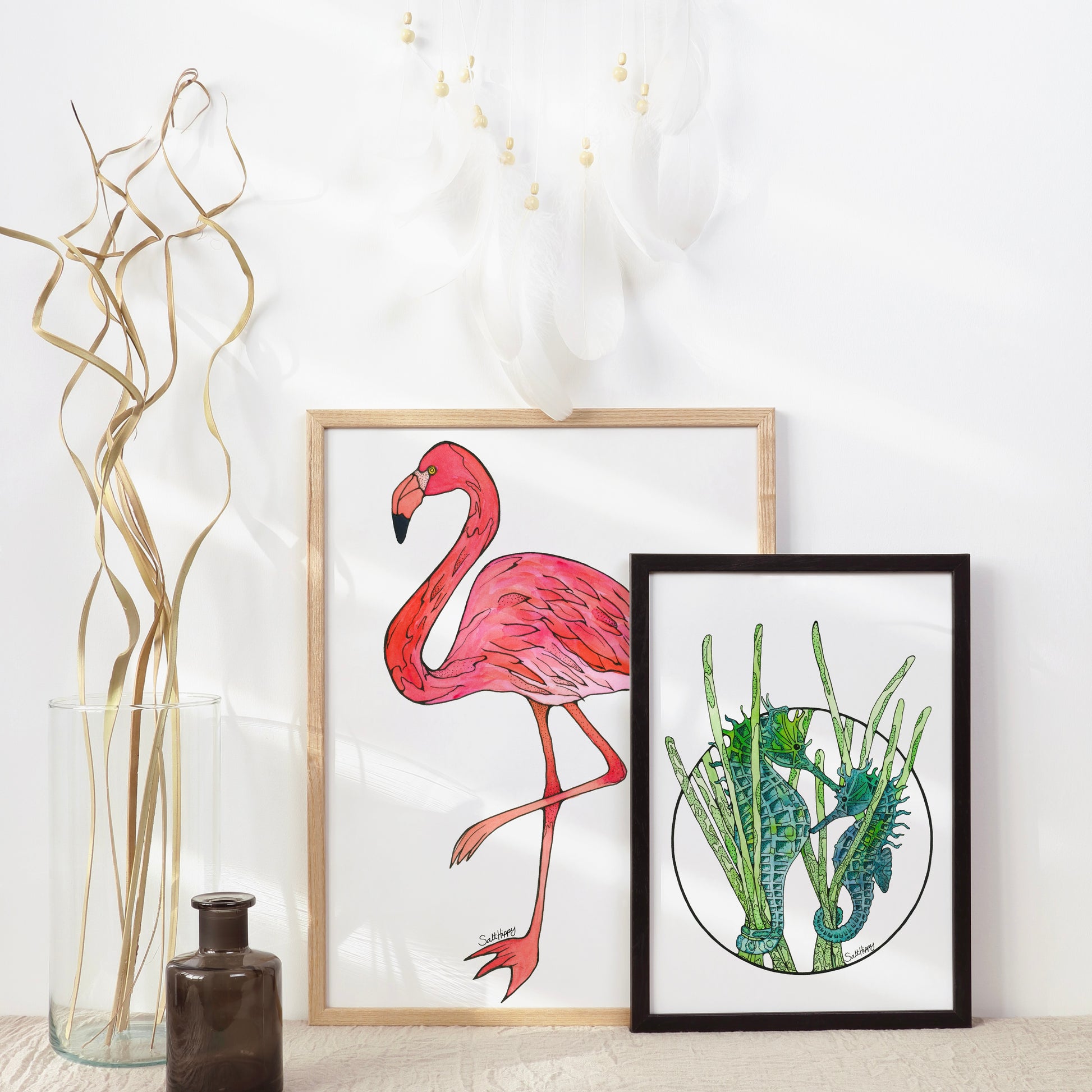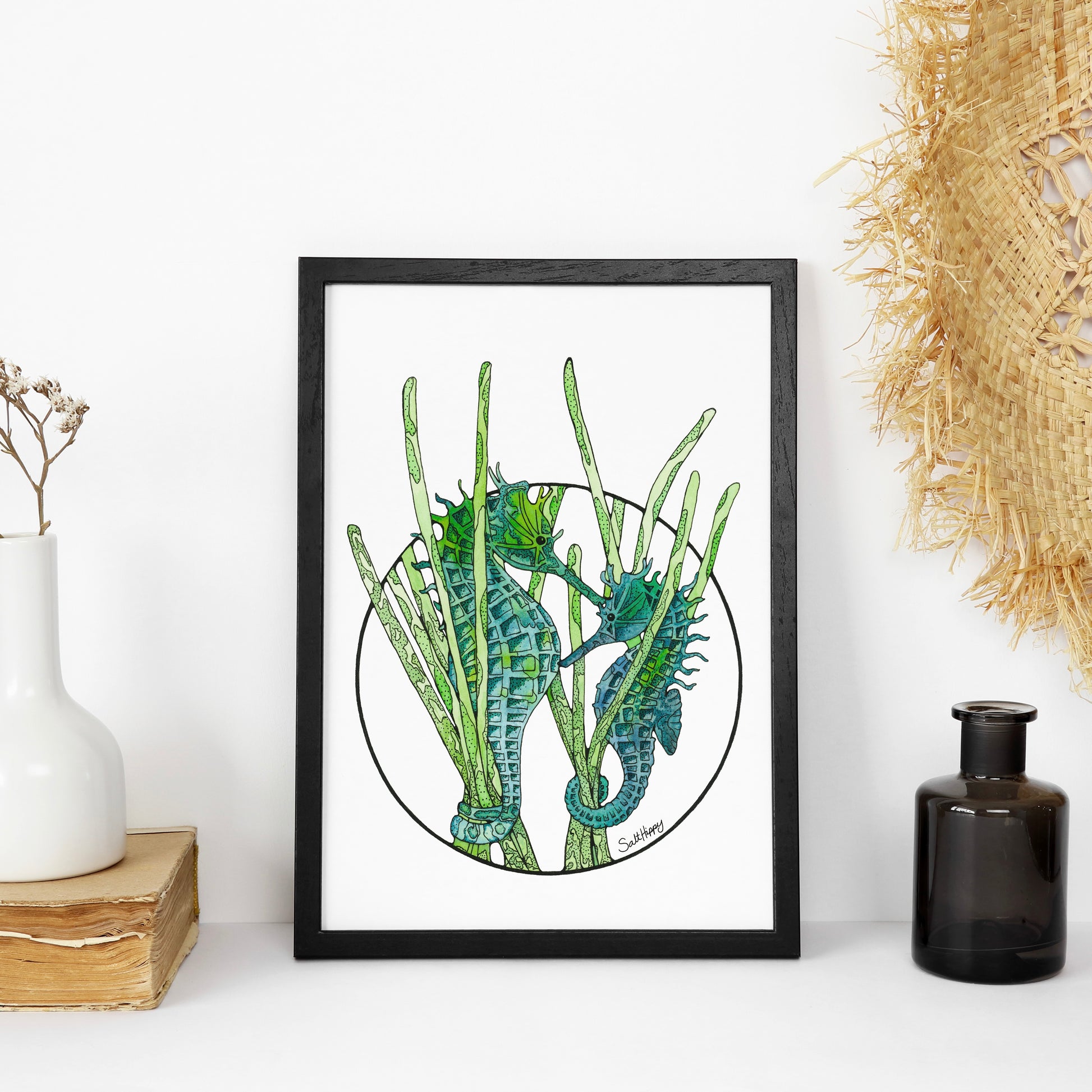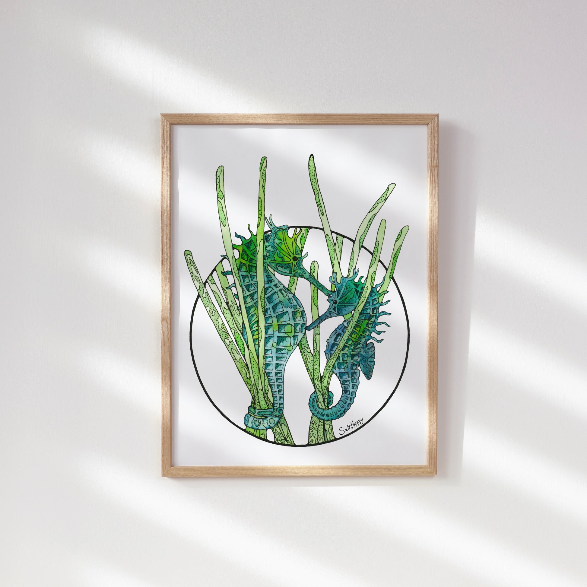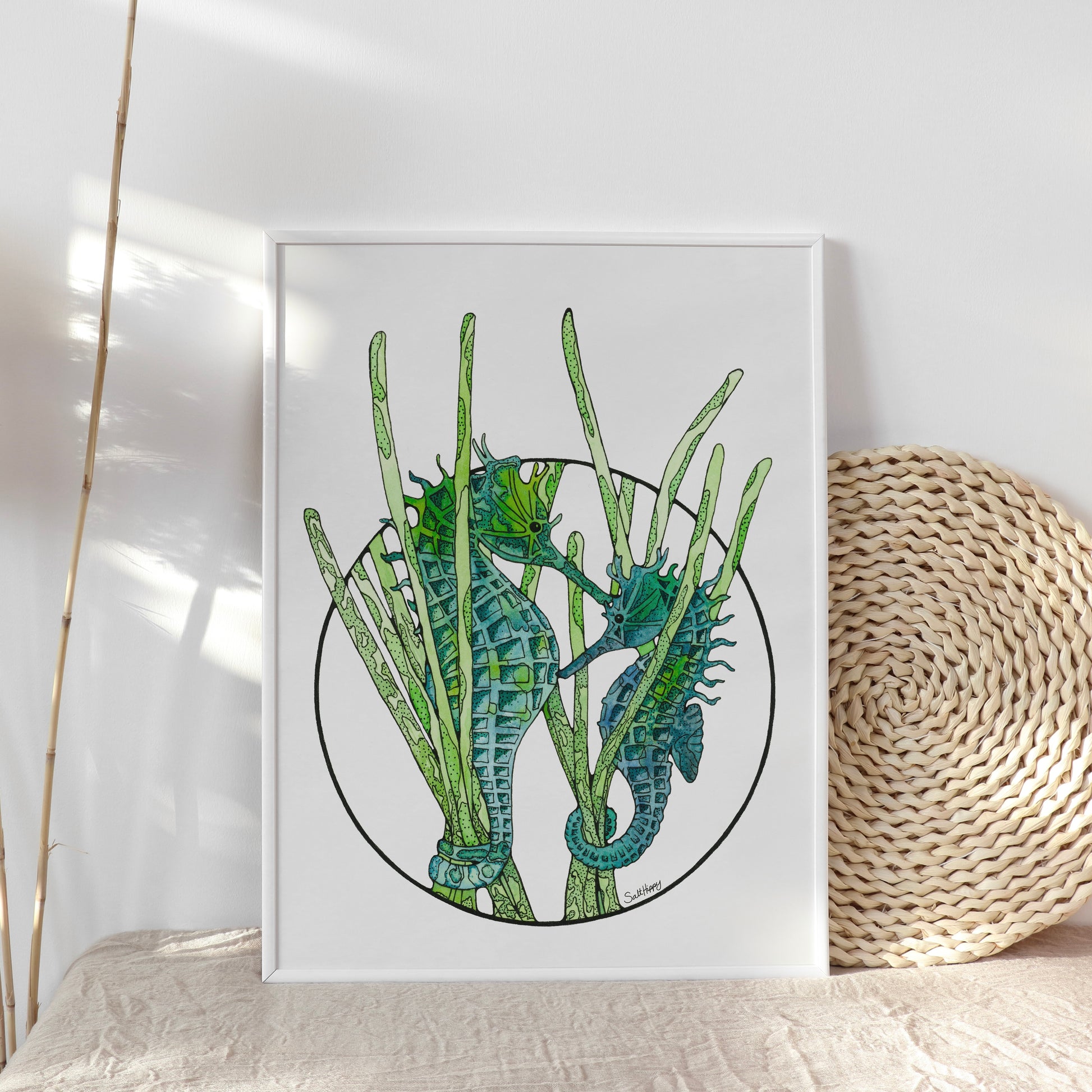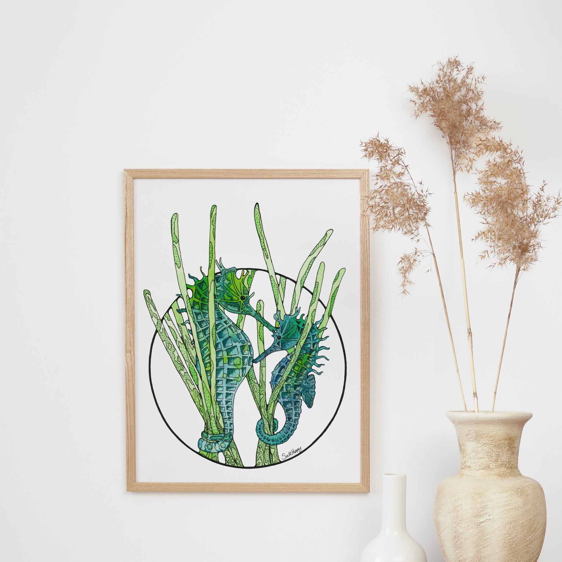 Delicate and full of oceanic charm, this hand-painted piece features two seahorses gently clinging to strands of flowing seagrass, their forms encircled by a bold black ring. Rendered in soft, textured layers of blue and green watercolor with fine ink detailing, the artwork brings a quiet intimacy to these graceful sea creatures.